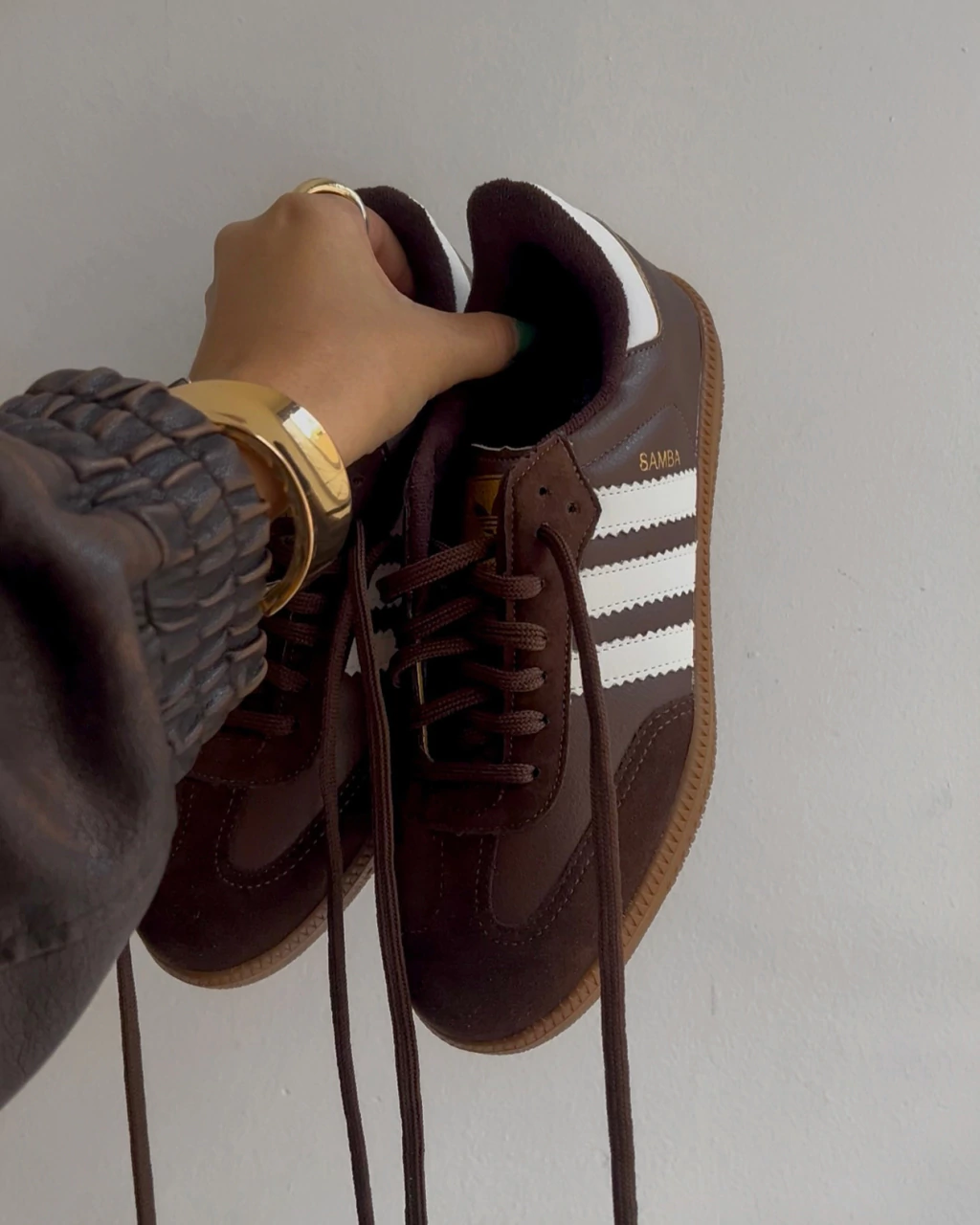 O Samba Marrom traz sofisticação discreta e muita personalidade em cada passo. O modelo Samba, vulgo o tênis mais bobado da internet, com certeza é uma tendência que veio para ficar! Depois de se tornar o favorito no hemisfério norte, ele conquistou o coração de todas as fashionistas por aqui. Além de ser um ícone clássico e atemporal, é estiloso, versátil e extremamente confortável. Um verdadeiro coringa que de adapta a diferentes estilos e combinações, seja com roupas de alfaiataria, jeans, vestidos ou até peças mais esportivas, ele transita perfeitamente entre o casual e o chic. Se você procura um tênis que una conforto, autenticidade e informação de moda, esse é o par ideal.